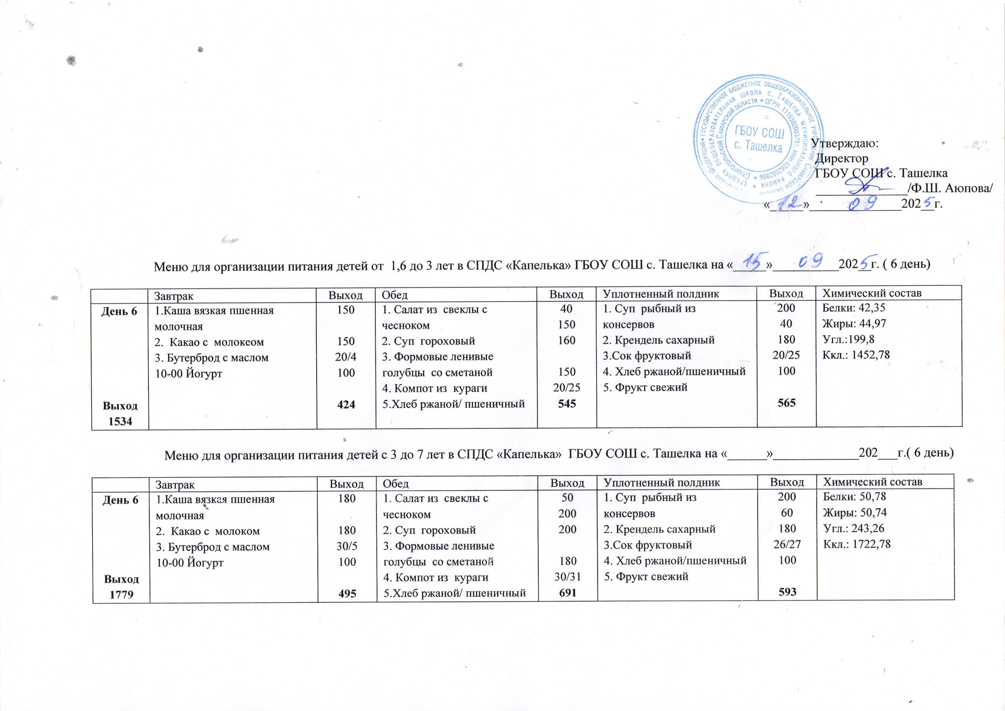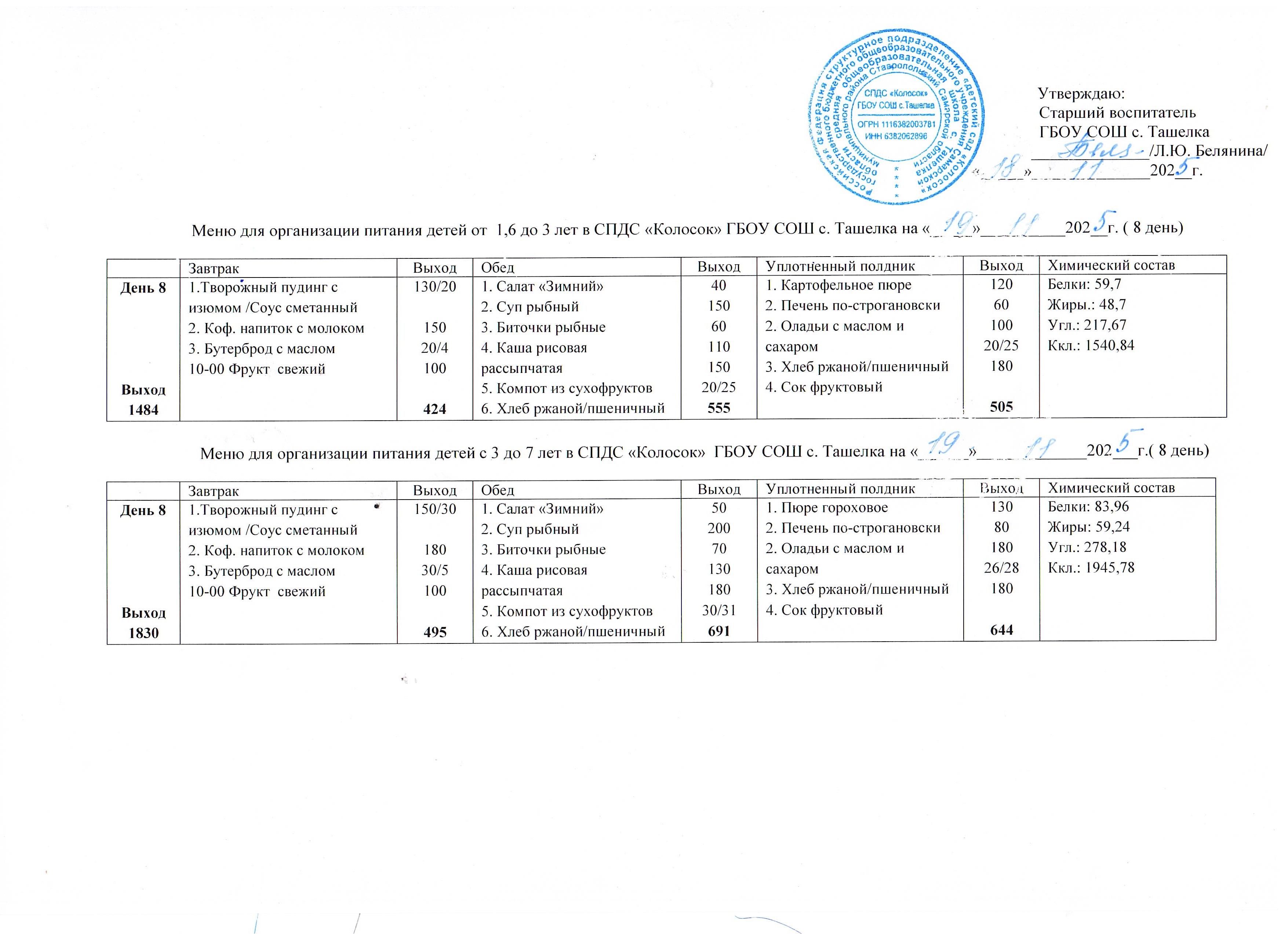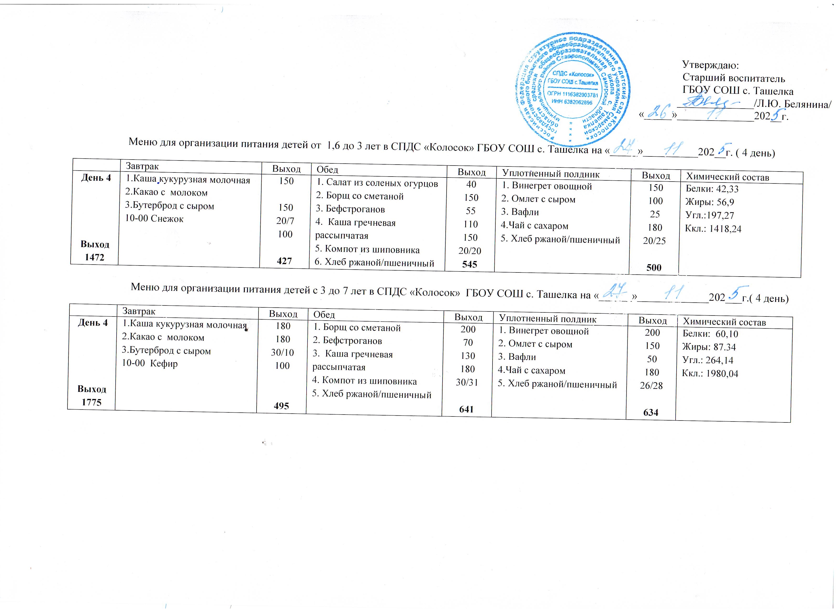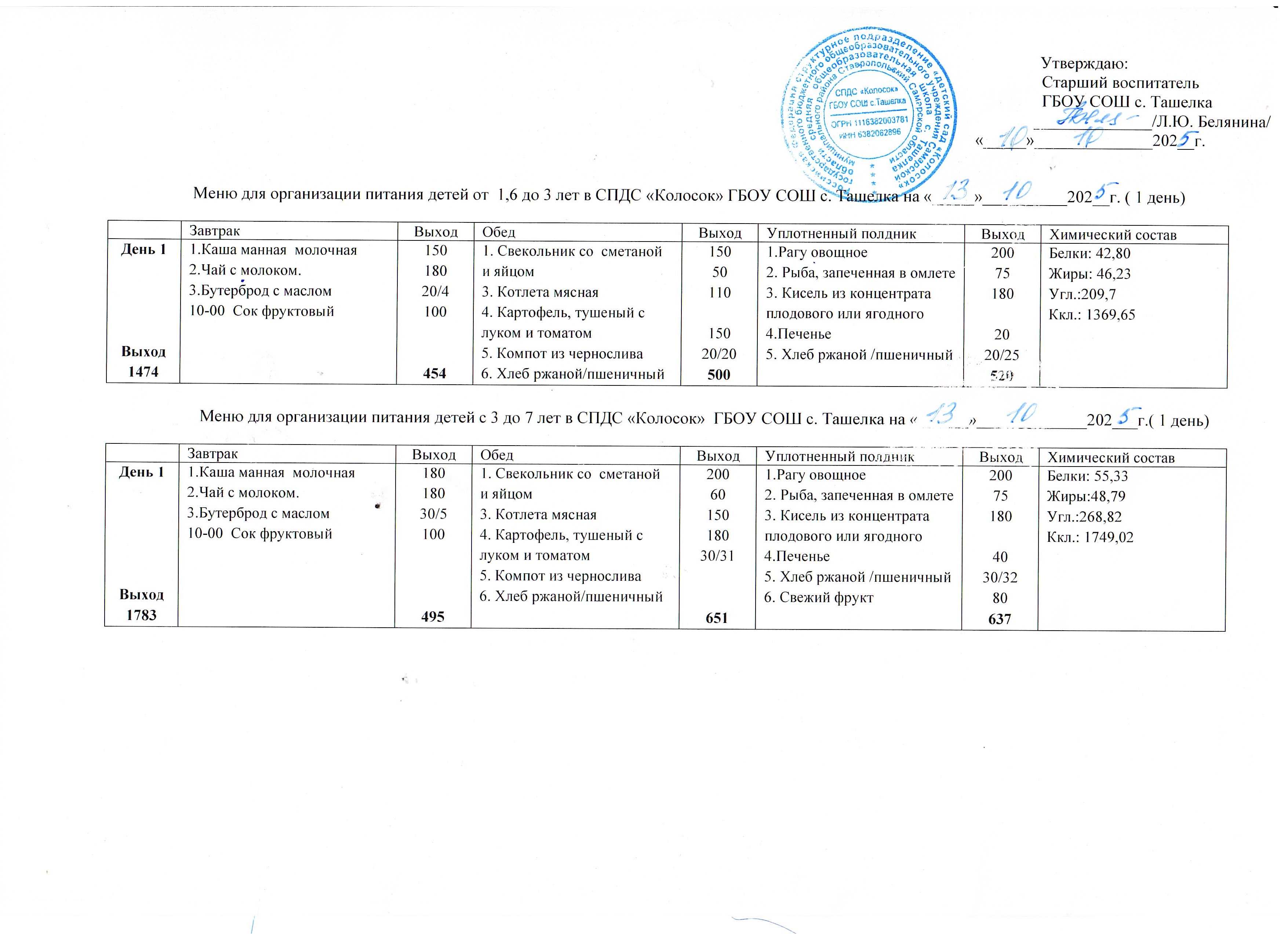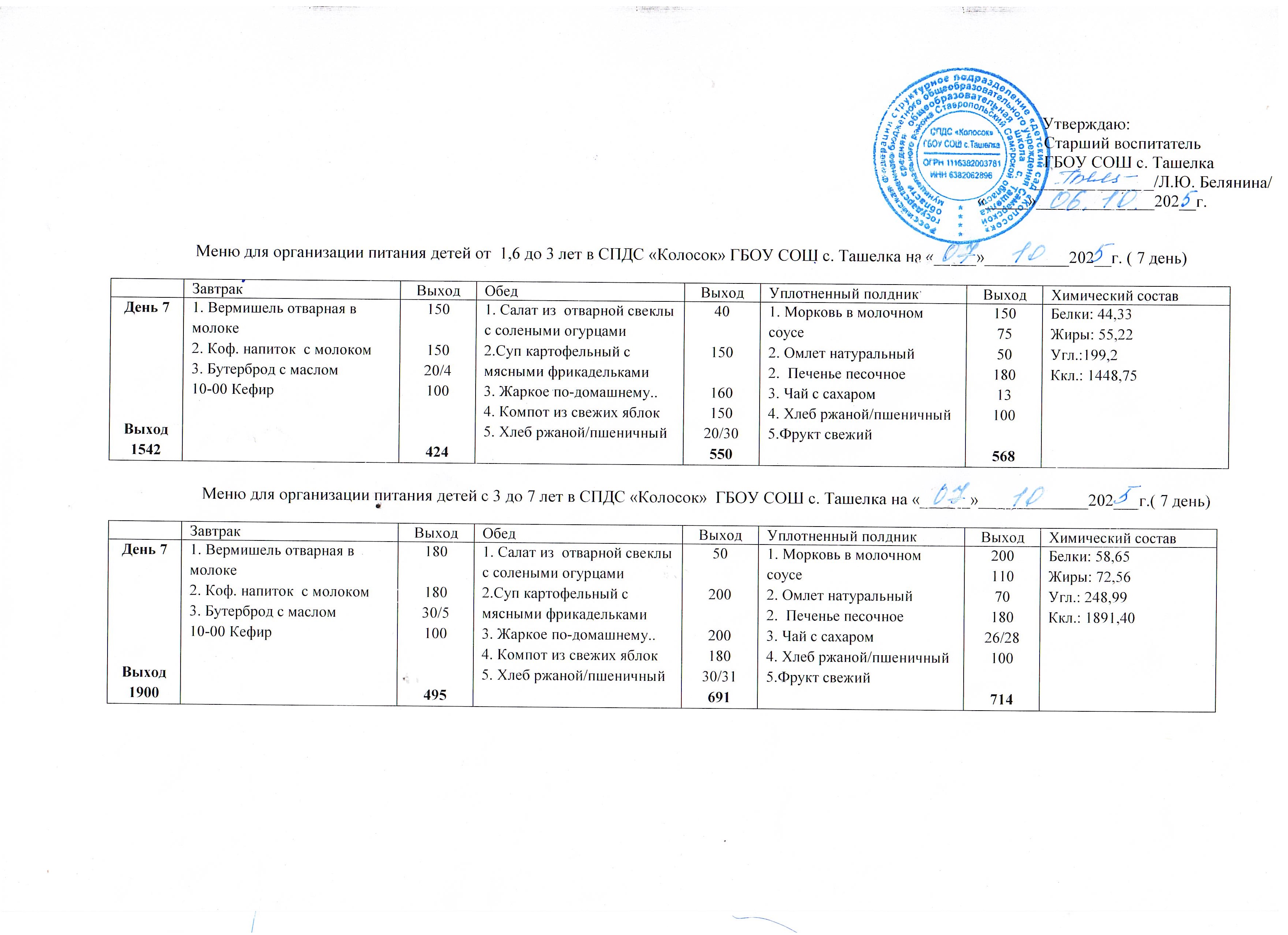 Утвержденное примерное меню (по сезонам в соответствии с возрастной категорией обучающихся)