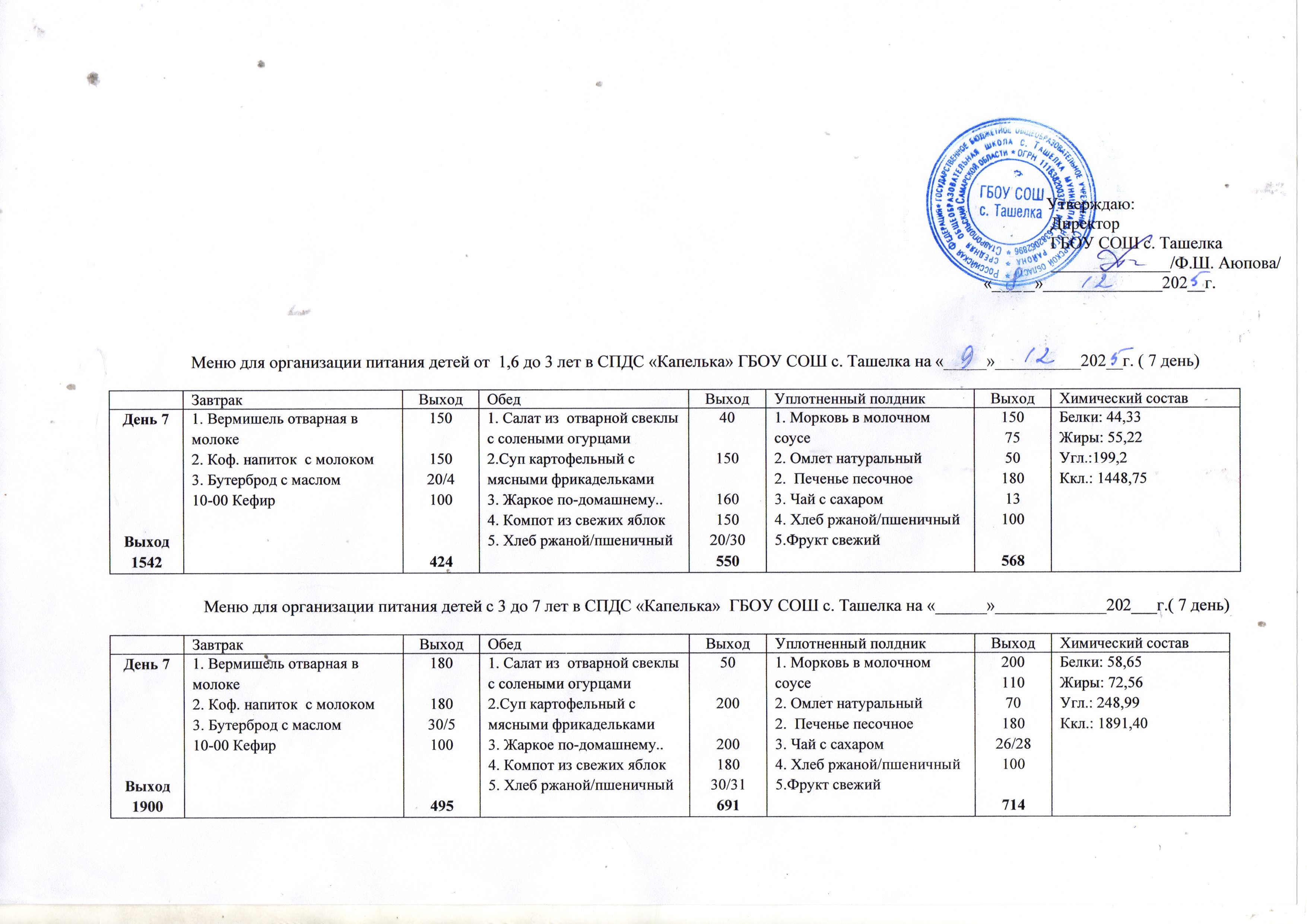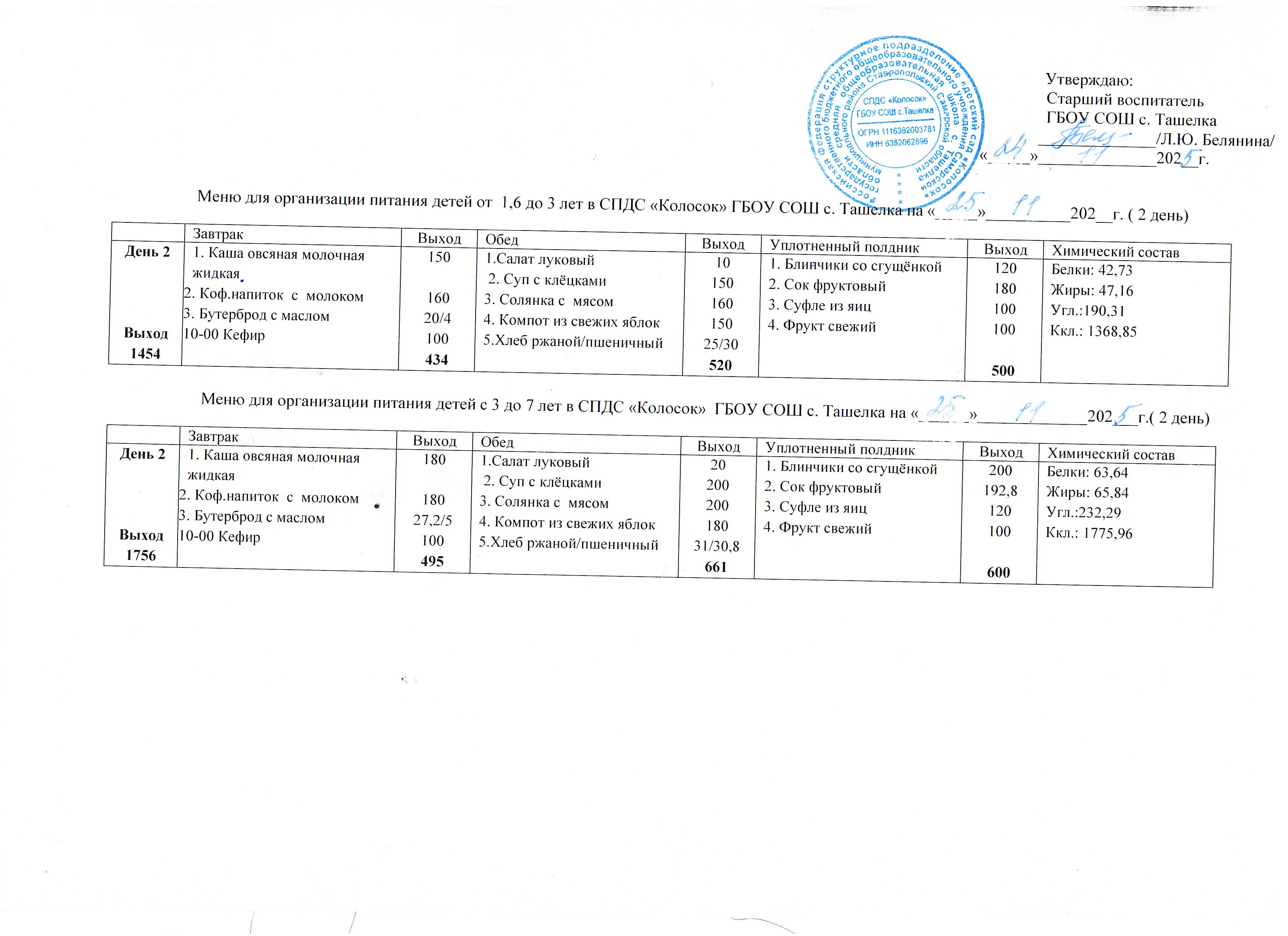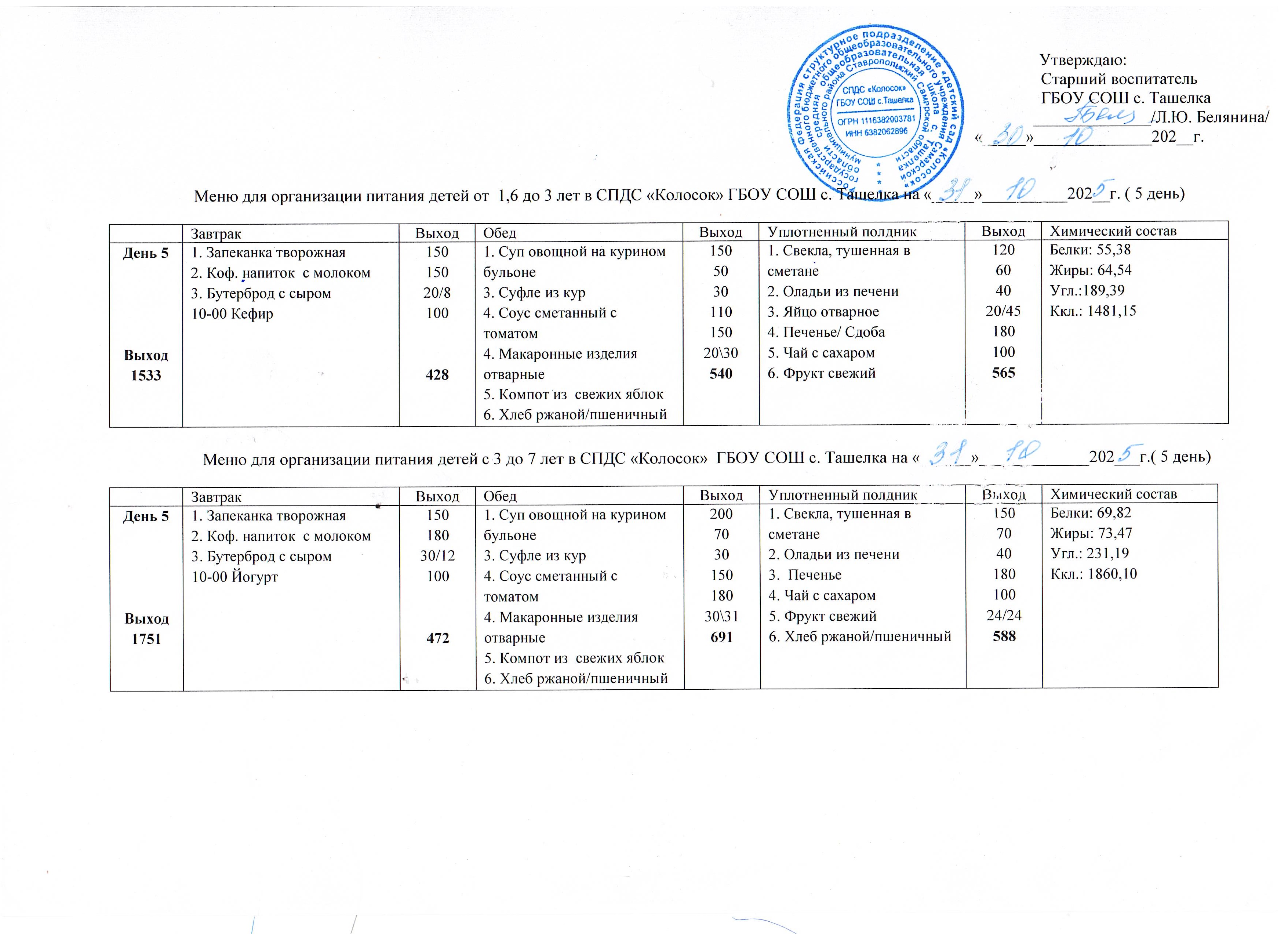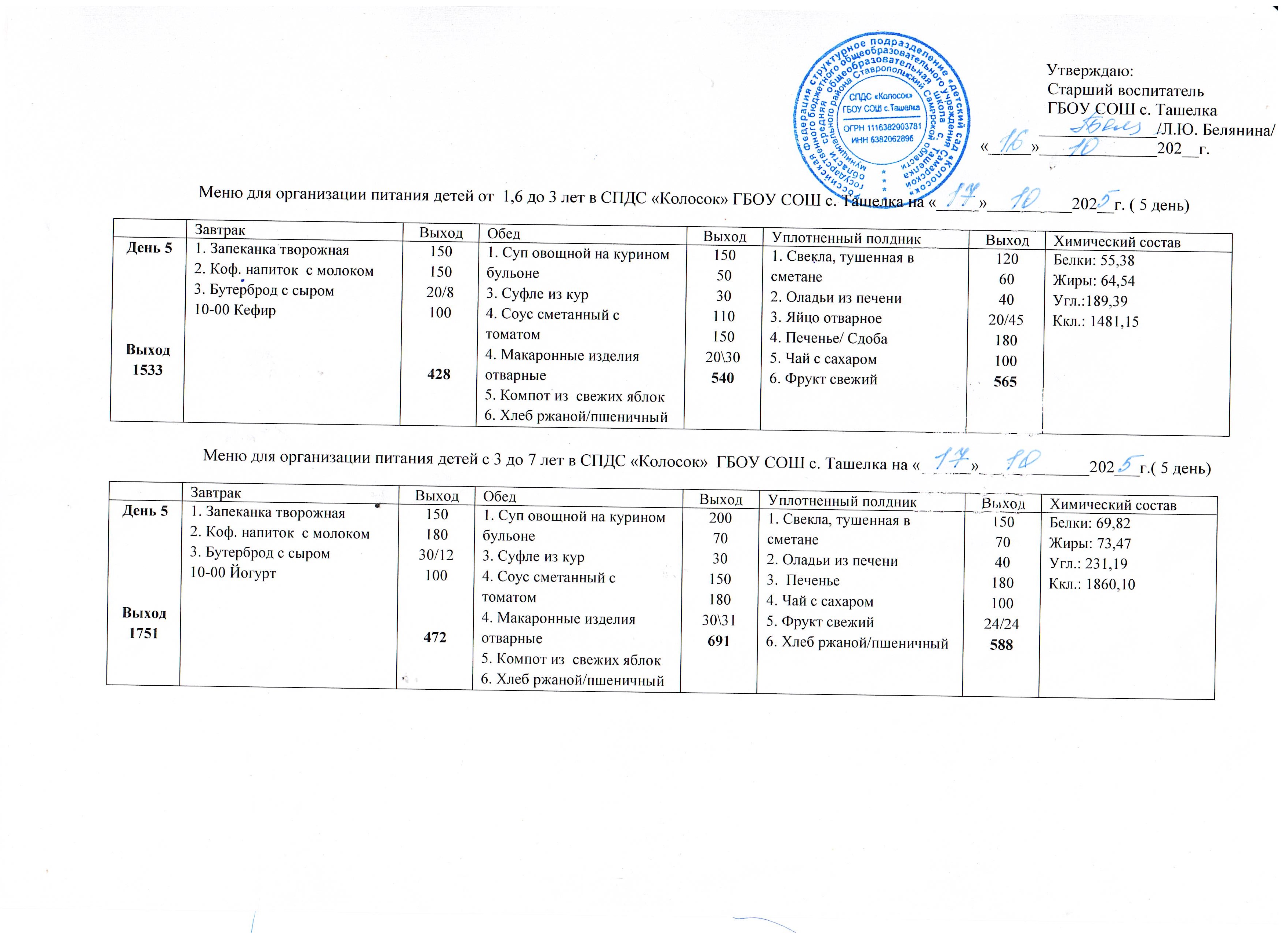 Утвержденное примерное меню (по сезонам в соответствии с возрастной категорией обучающихся)